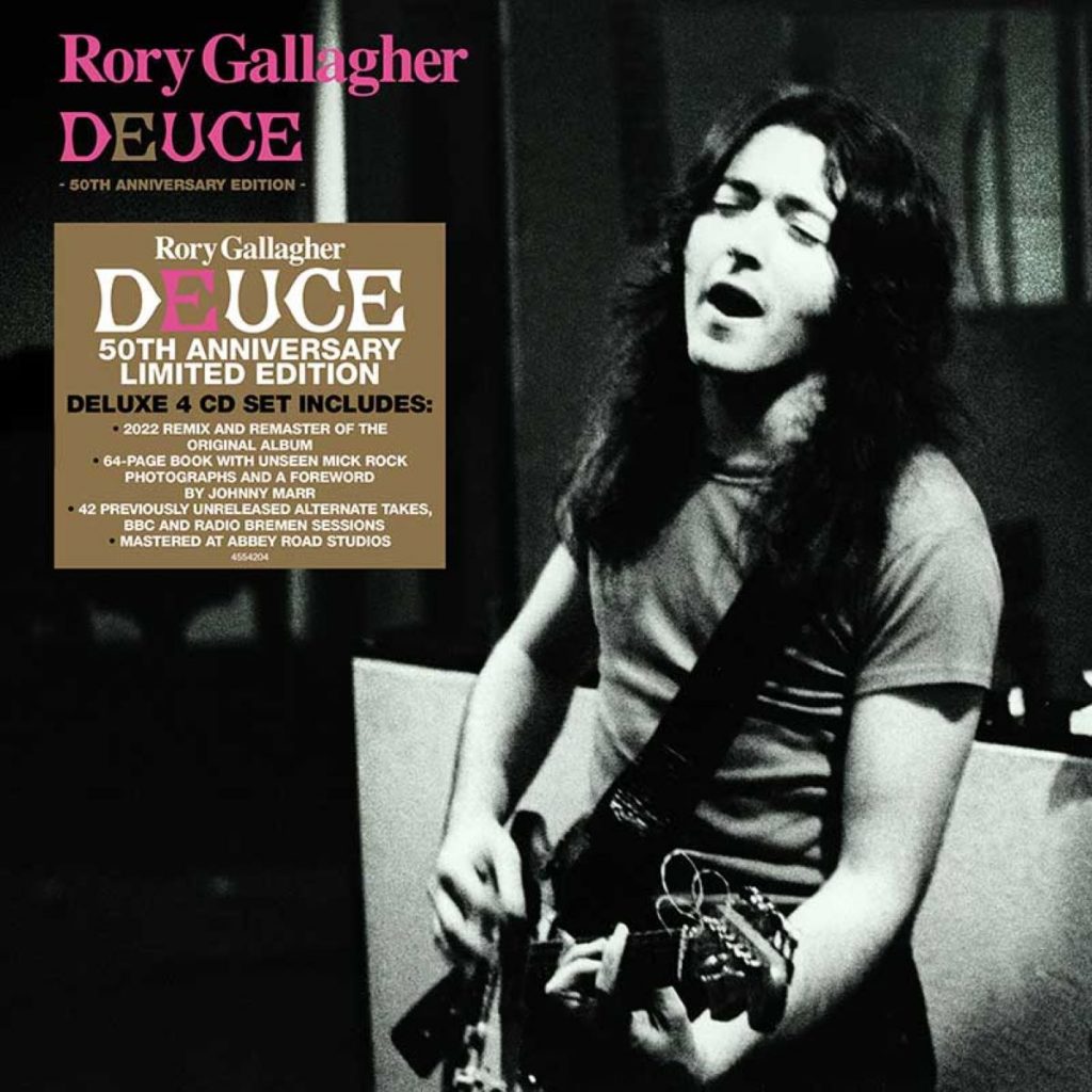 The Deuce 50th Anniversary Edition deluxe box set is anextensive celebratory release that digs deep into the Rory Gallagher archives and will include a new mixof the original album, twenty-eight previously unreleased alternate takes, a six-song 1972 BBC Radio In Concert, and seven Radio Bremen radio session tracks. The package will contain a 64-page hardback book with a foreword by Johnny Marr of The Smiths, unseen images by the late Mick Rock, essays, and memorabilia from the album recording.
