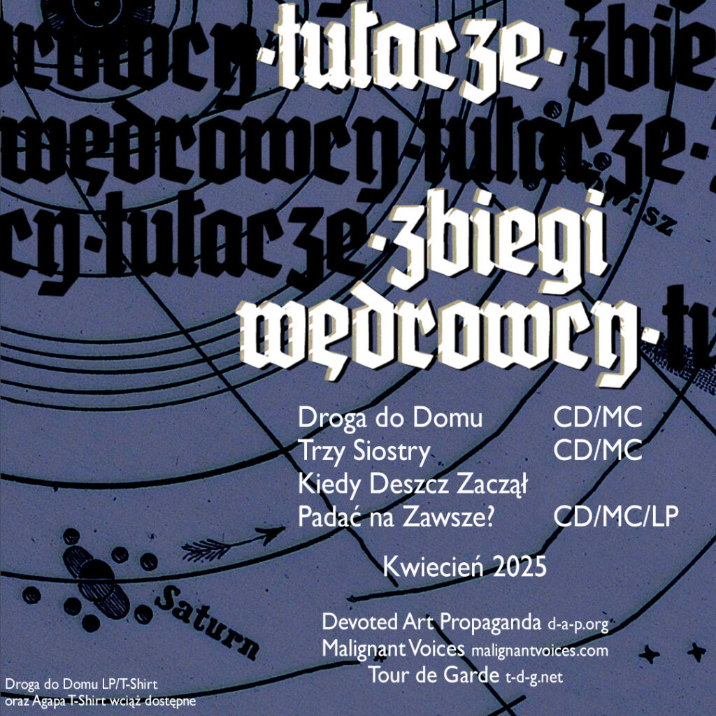 Finally, the concluding chapter, Droga Do Domu (The Way Back Home), the band’s farewell transmission released on vinyl in December 2024, now materialises on CD and cassette. This final parallax, a journey both new and familiar, finds its digital and magnetic forms through the same coalition of labels for the CD release (Devoted Art Propaganda, Malignant Voices, Tour de Garde) and solely via Devoted Art Propaganda for the cassette.